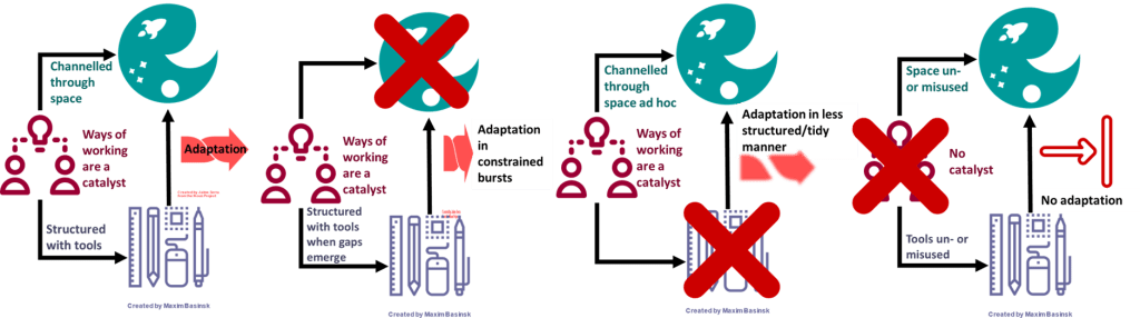 Effectively, I see it a little like the diagram below. The tools and space to adapt are necessary components, but are not sufficient for adaptation to occur. You need those ways of working: