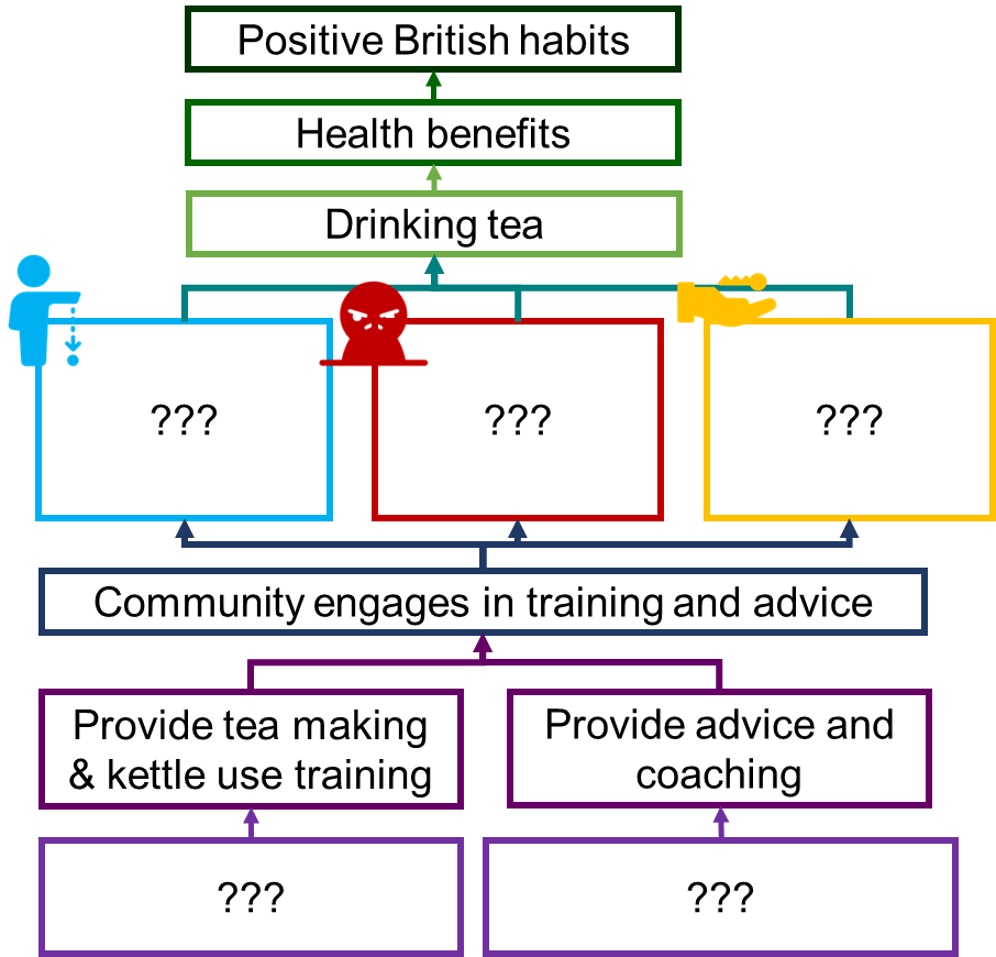 These give some building blocks, where ‘advisory support, training, and coaching’ form the goods and services being provided, ‘small community’ forms the reach, and ‘drink more tea’ represents a behaviour change. The health benefits of tea and positive British habits form direct benefits, or even possibly a sustainable positive change:
