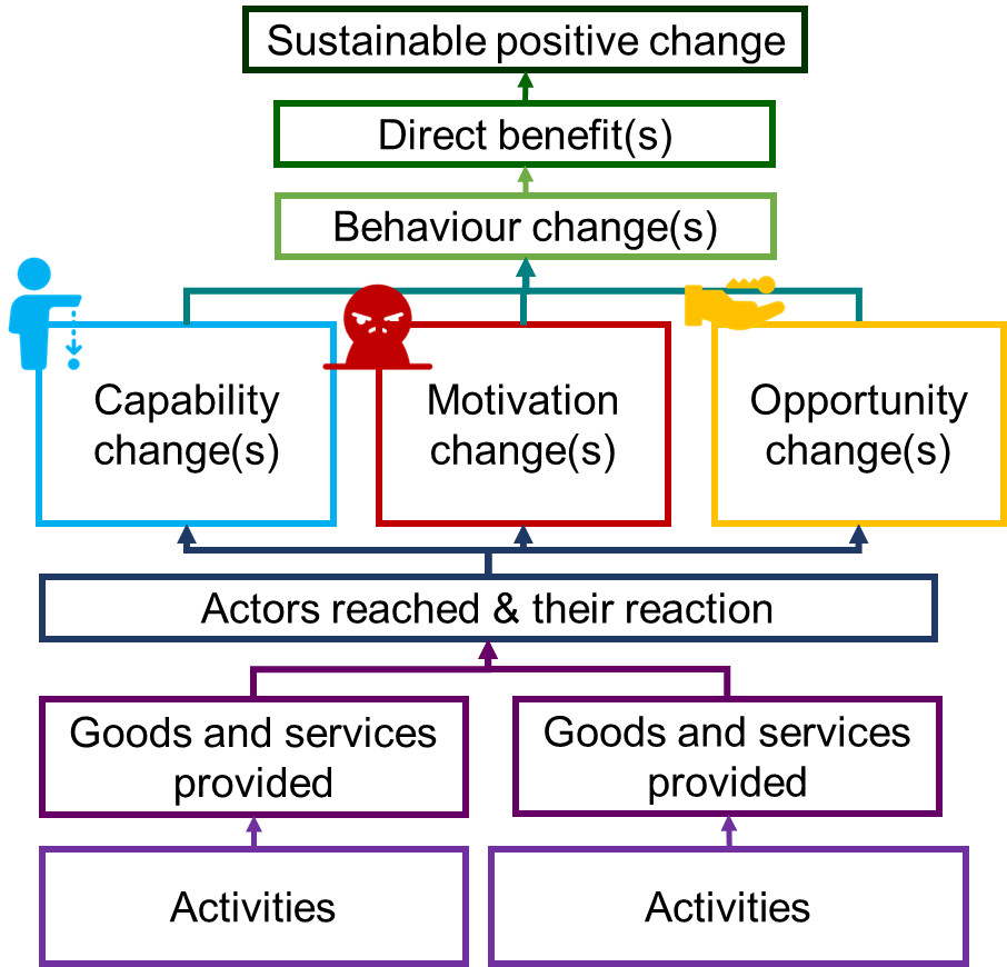 Ultimately, when trying to change things, you do some stuff, which produces some kind of good and/or service, which reaches the right people who react in change-conducive ways, who then gain some kind of capabilities, opportunities and motivations (click here for more on this) which then leads to behaviour change. That behaviour change (either individual, group, organisational, or systemic) will allow a direct benefit to occur, which contributes to what maybe calls a ‘wellbeing change’. Personally, I find it easier to frame ‘wellbeing change’ as a ‘sustainable positive change’ to be more inclusive of non-development style programming.